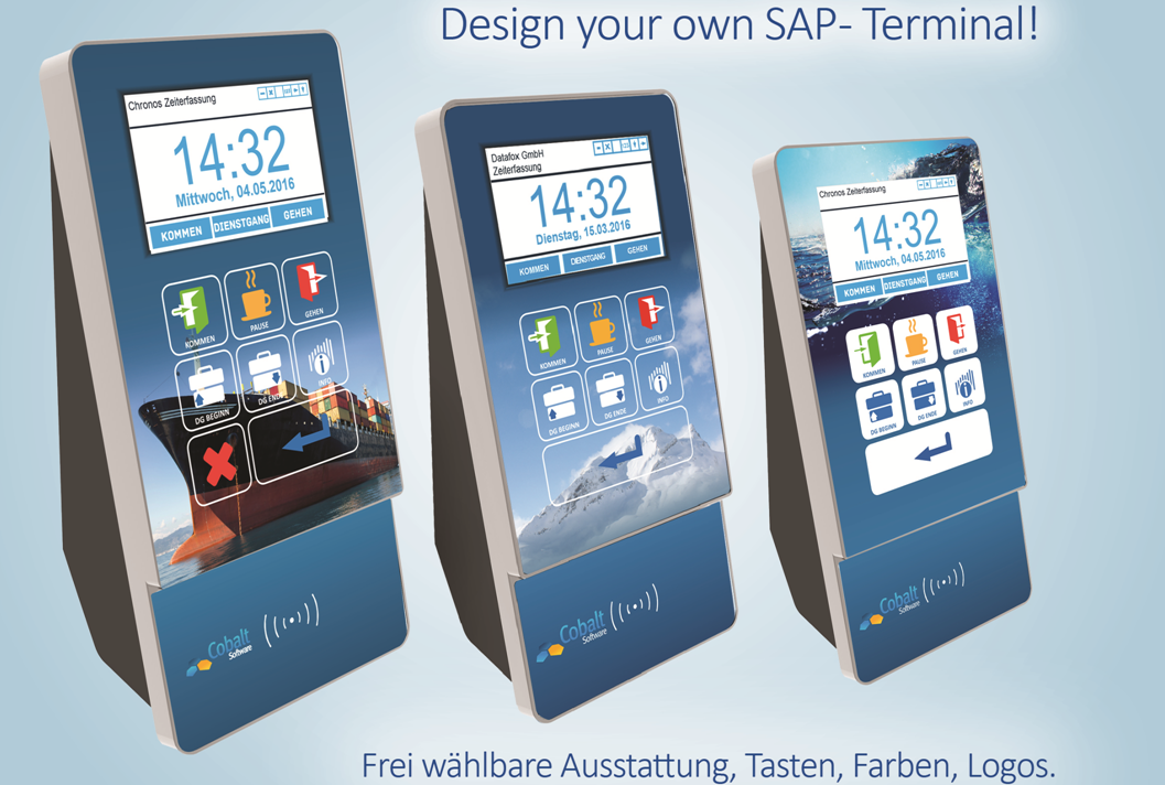 Die Chronos Zeiterfassung für SAP SuccessFactors und SAP ERP HCM kann mit verschiedenen Zeiterfassungsterminals betrieben werden. Die Erfassung von "Kommen", "Gehen", "Pause" und "Dienstgang" und die sofortige Übergabe dieser Zeitereignisse an SAP ist bereits mit Standardfunktionen realisierbar. Die freie Gestaltbarkeit der Geräte und vielfältige Konfigurationsmöglichkeiten erlauben kundenindividuelle Implementierungen.